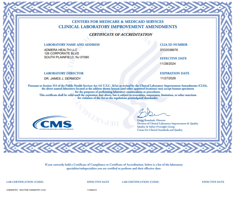 A CLIA certification is a federal credential overseen by the Centers for Medicare & Medicaid Services (CMS), in collaboration with the FDA and CDC, that ensures laboratories performing human diagnostic tests meet rigorous standards for accuracy, reliability, and timely reporting.